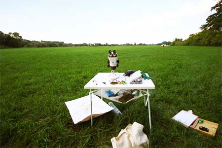 Mit dem Pleinair waren zwei Ziele verbunden. An erster Stelle galt es praktisch zu erproben, ob und wie eine Zusammenarbeit von Künstlern, Natur- und Geisteswissenschaftlern sowie Planern an einem gleichen Landschaftsausschnitt, im direkten Miteinander möglich ist. Was haben sich die unterschiedliche Wahrnehmungs- und Arbeitsweisen zu sagen, können sich das unterschiedliche Wissen, die angewandten Methoden und die eingenommenen Perspektiven auf den Gegenstand ergänzen, einander erhellen, neue Einsichten eröffnen? Hier nahm das Pleinair einen Faden auf, der ein gutes dreiviertel Jahr zuvor auf einer Tagung der deutschen Sektion der Internationalen Gesellschaft für Landschaftsökologie (IALE-D) in Nürtingen zu spinnen begonnen wurde. Damals konnte ein möglicher Beitrag der Künste für eine geschärfte, auf nachhaltige Landschaftsgestaltung ausgerichtete, Position beziehende Landschaftsforschung nur theoretisch in Vorträgen und im Rahmenprogramm über das Kunst-Honig-Projekt von Christiane Wartenberg (IALE abstracts 2010) und Robert Lenz (Landschaft im Honig) angerissen werden (siehe www.kulturlandschaft.iale.de Archiv für Kunst und Landschaft). Im Hörsaal in Nürtingen wurde verabredet, einen praktischen Versuch in einer konkreten Landschaft folgen zu lassen.